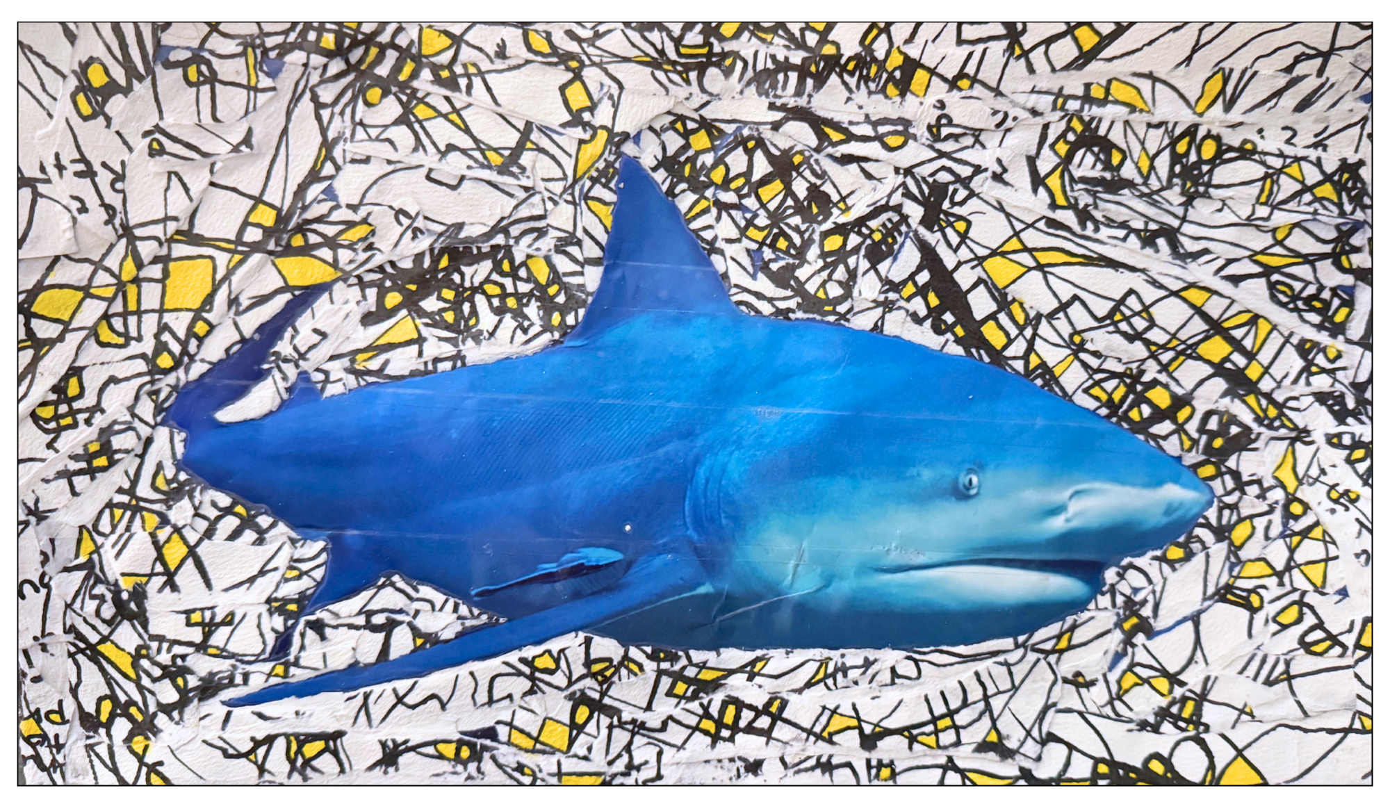 However, I realized that deconstructing the work was part of my journey. By ripping the paper into strips, I moved into a "collect" mode. I then reintegrated these pieces with the image of a lemon shark—a subject that resonated with my state of flow—to bring context and focus to the original fluidity of the exercise. This transformation taught me that even a "failed" attempt is meaningful material for construction.