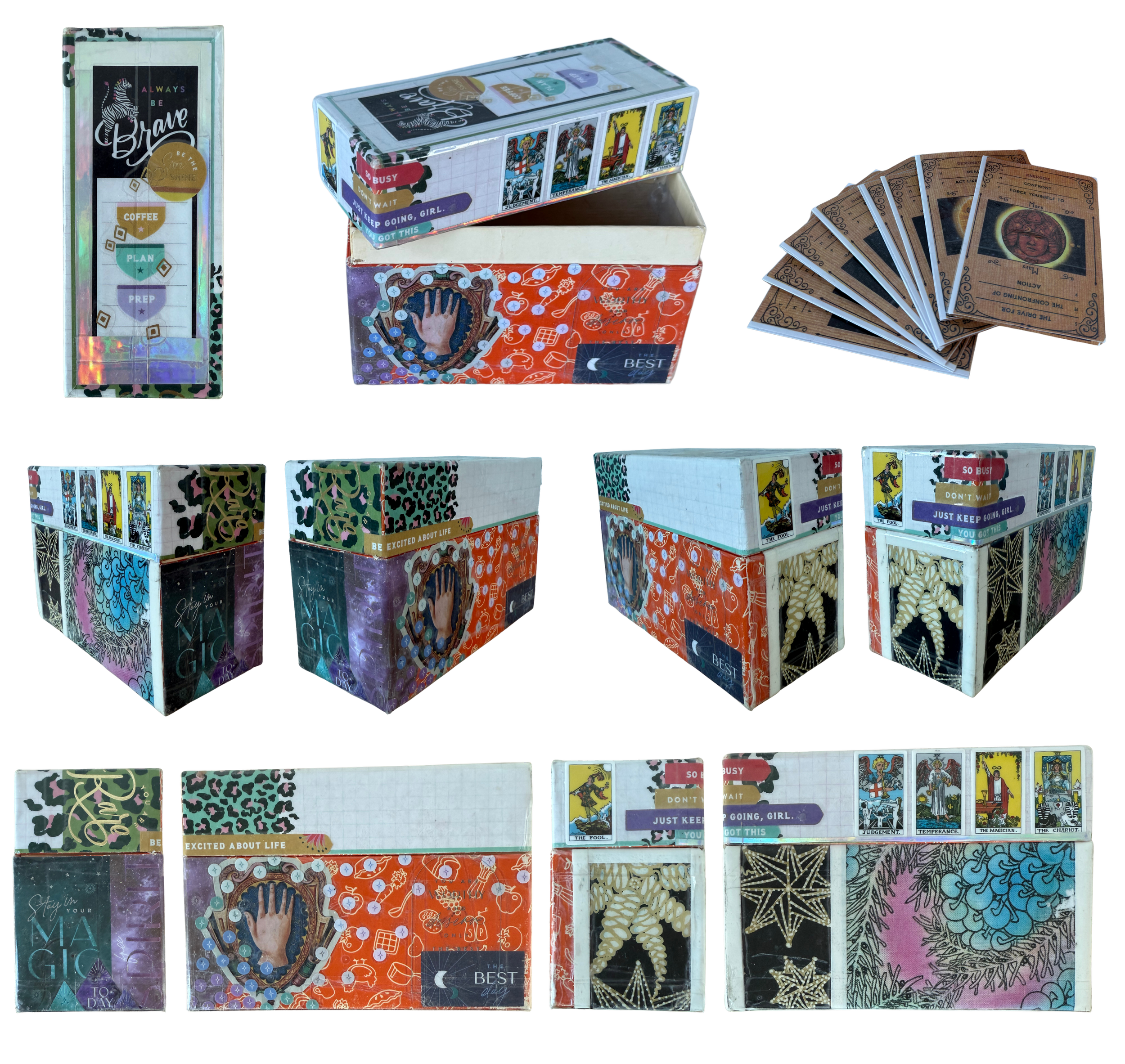 The box enhances the spirit cards by providing them with legitimacy and weight. The vibrant leopard prints and tarot-inspired collage work signal that the contents are special and intentional. By creating a custom "home" for these cards, the artwork validates the creator’s intuition and spiritual practice, elevating the cards.