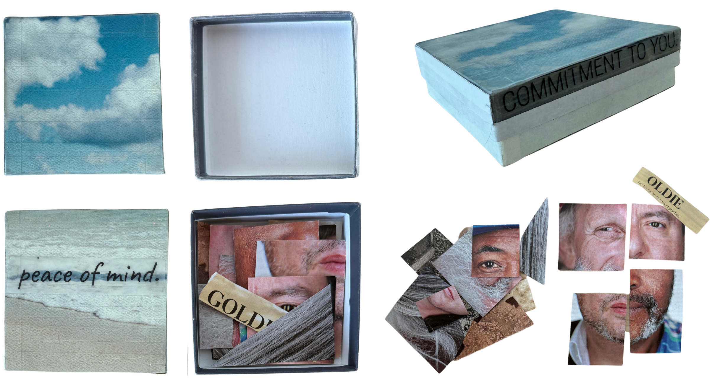 The interior houses fragmented photographs of aging skin, silver hair, and fine lines. By inviting the viewer to piece together these "imperfections" like a puzzle, the project reframes aging not as a loss of beauty but as a realistic and normative evolution. It encourages an identification with the authentic self, honoring the "gold" found in lived experience.